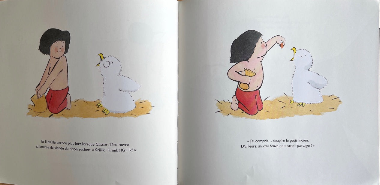 Castor-Têtu is only 5 years old. But he decided to become a real brave man. For that, he needs a feather: an eagle feather. And where does the eagle live? At the top of the mountain! His father gives him a bow and an arrow; her mother, a bag of provisions; and off he goes. His trip will not be easy, his meetings will not always be happy ... But papoose is aptly named: no one can stop Castor-Têtu! Neither a hungry eagle, nor a terrible vulture; not even the eagle ...